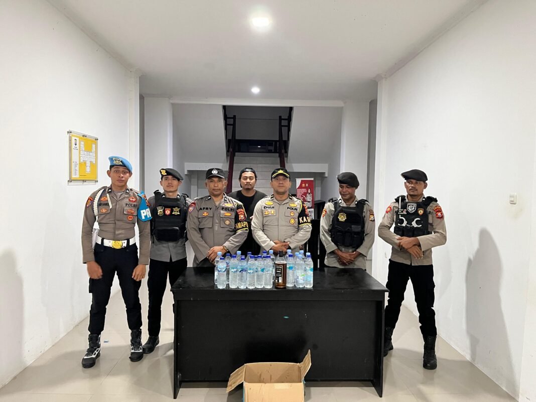 diketahui, barang bukti hasil sitaan yang diamankan berupa 25 miras dalam botol Aqua berukuran sedang jenis cap tikus, 1 botol whisky pada tiga warga pemilik barang masing masing berinisial LM, Ibu rumah tangga inisial A, dan di sebuah Room Karaoke ALM, (Red)
