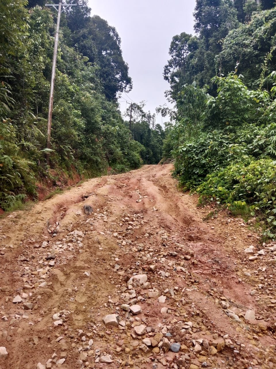 Amatan media ini, kondisi kiri dan kanan jalan penuh dengan lubang. Batu timbunan pun sudah berhamburan sehingga menyulitkan kendaraan yang lewat, dan mudah kecelakaan.