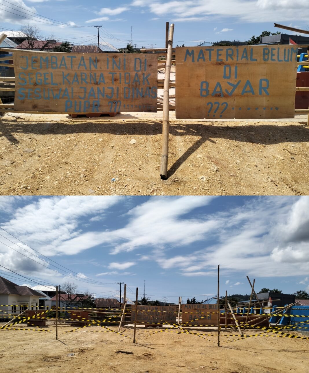 Bobong, ufutimur.com — Sebuah Peristiwa mengejutkan terjadi di lokasi Proyek Pembangunan Jembatan Fangahu, Desa Bobong Kecamatan Taliabu Barat. Betapa tidak, proyek yang baru selesai dikerjakan pada bulan Maret 2026 lalu, dipalang sekaligus dipasang Police line dan papan yang bertuliskan, “Jembatan ini disegel karna tidak sesuai janji Dinas PUPR???” serta “Material belum dibayar???”. Tulisan tersebut mengindikasikan adanya persoalan serius dalam pelaksanaan proyek, mulai dari dugaan ketidaksesuaian komitmen hingga persoalan pembayaran material.